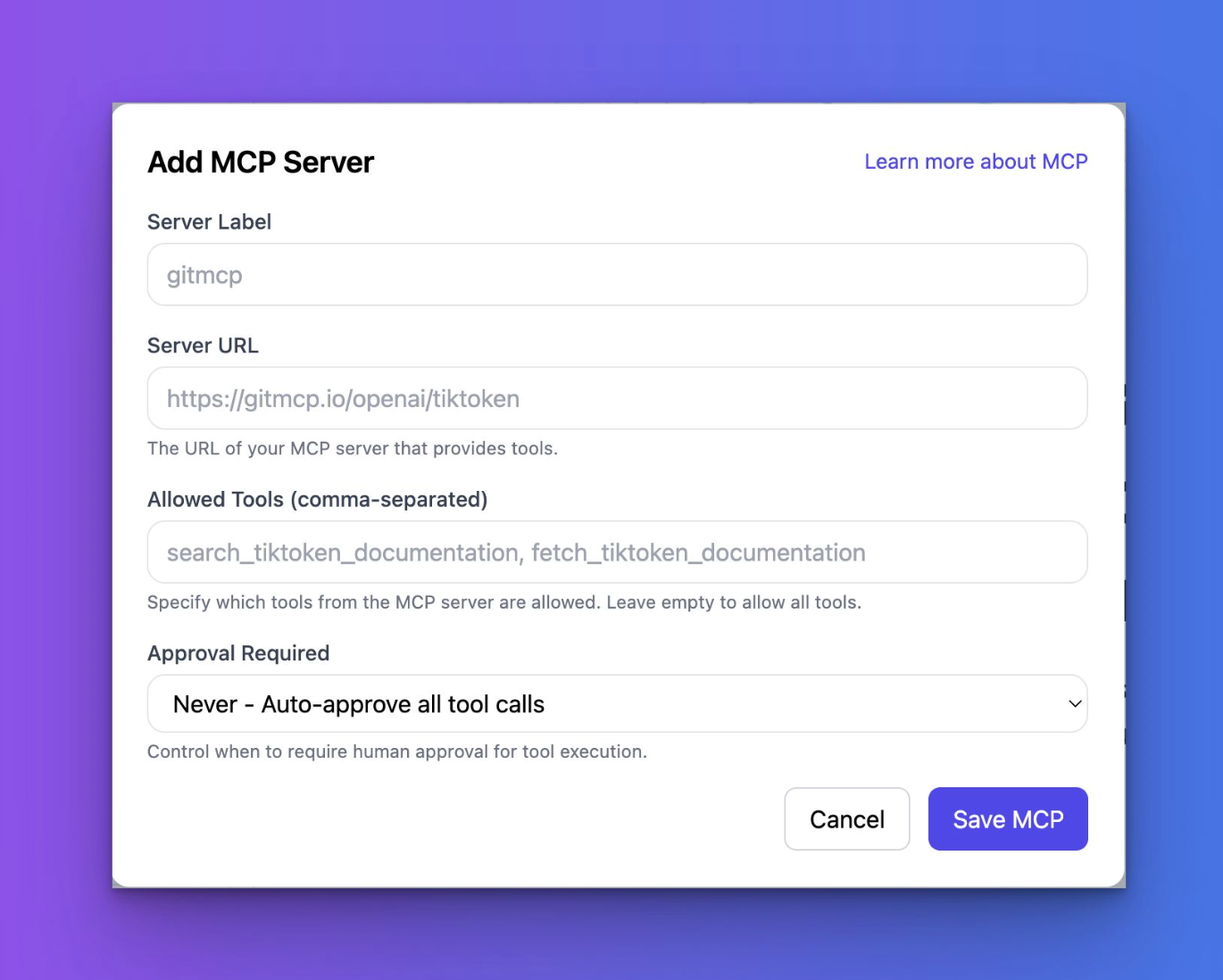 How to enable MCP for your app? From your dashboard, click on the edit pencil icon for your app. Once you set the model to OpenAI, you'll see the option of adding MCPs in the Action tab. Each MCP will require a server URL and the MCP name for it to work ๐