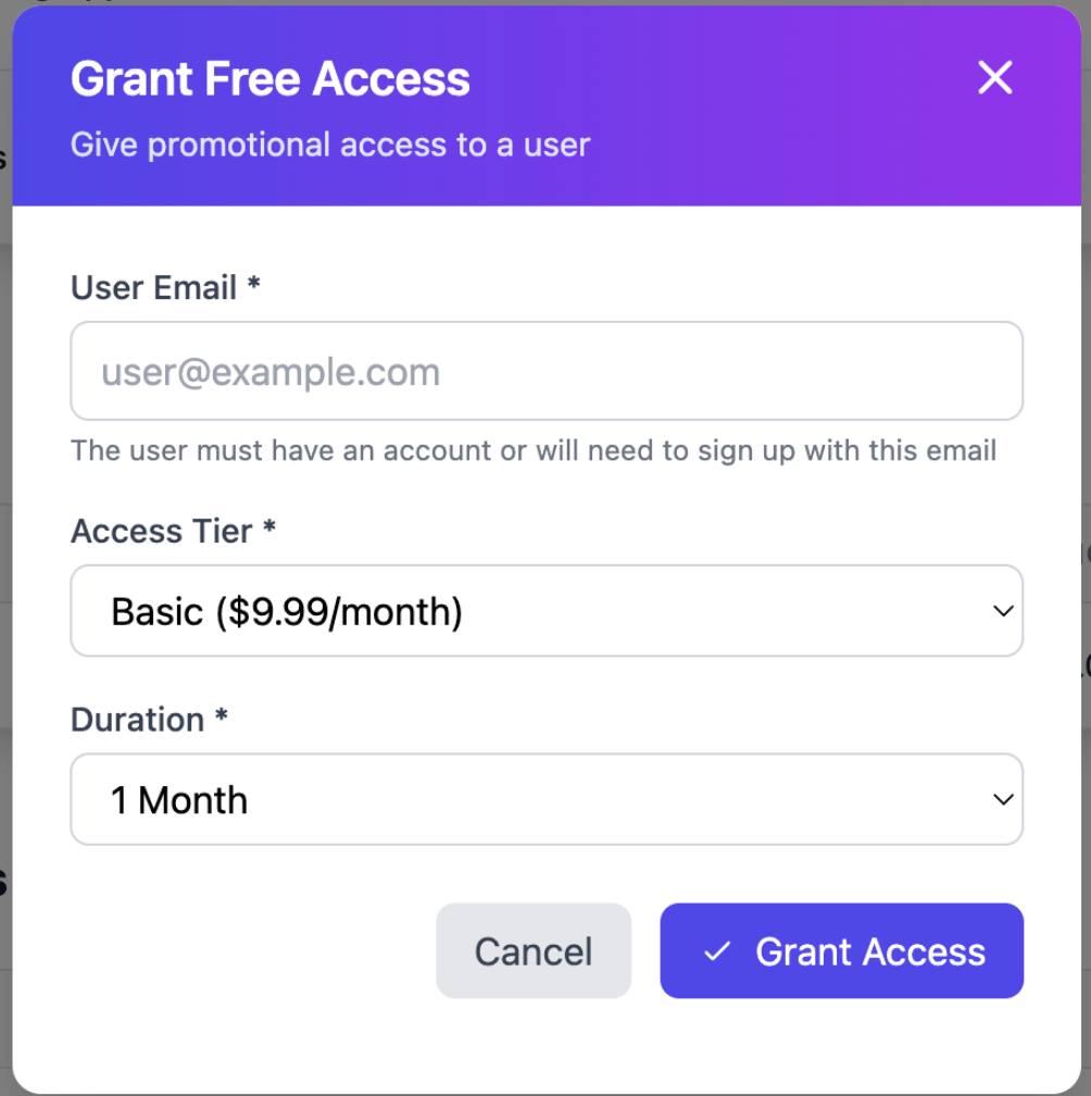 Go to your Studio Analytics page, find the Subscribers section, and click "Grant Free Access". Enter the user's email (they must have a CalStudio account), select the tier you want to grant, choose the duration, and click Grant Access. The user will receive an email with a link to access your studio immediately