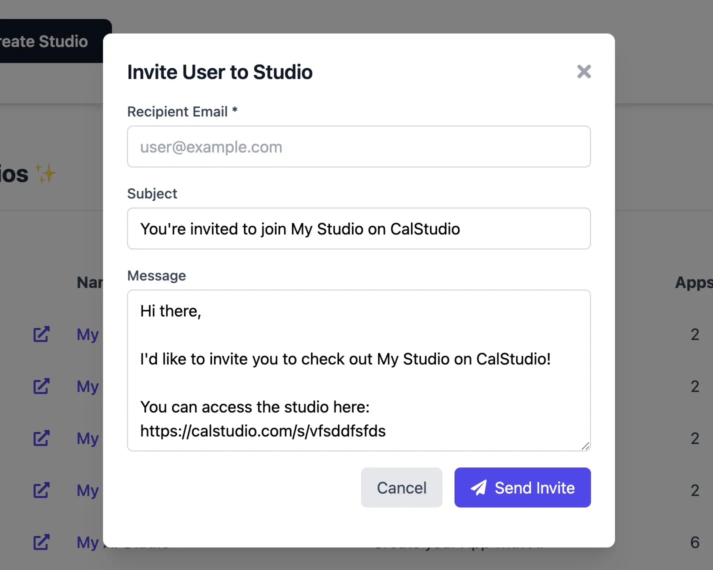 You can now send personalized email invitations directly to users, inviting them to check out your studio or appโgreat for outreach, onboarding new customers, or sharing your creations with potential users.